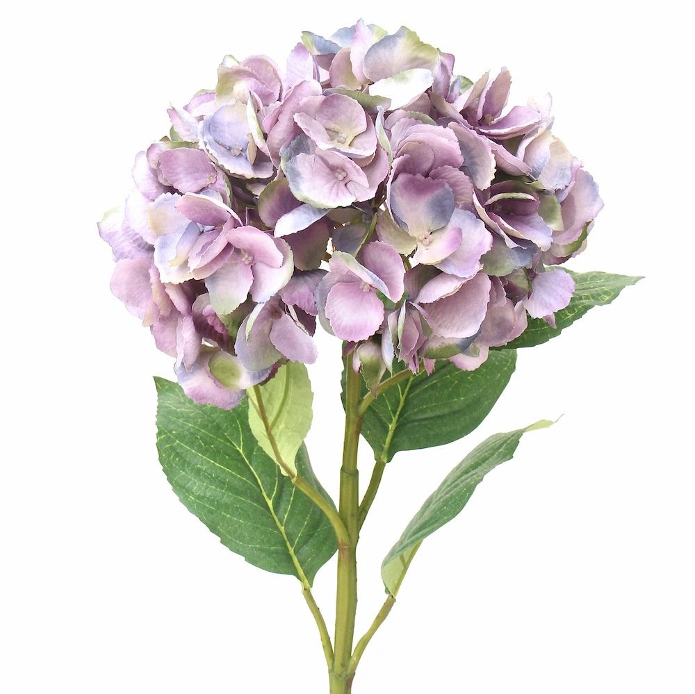 Shades of purples, greens and blues in the petals of this bloom blend together perfectly to reflect nature in this beautiful aged style of hydrangea. The generous head has veined petals with feathered edges and sits atop a natural looking stem with four leaves - stem is wired so that it can be can shaped as desired and the stem can be cut or folded to achieve a shorter style