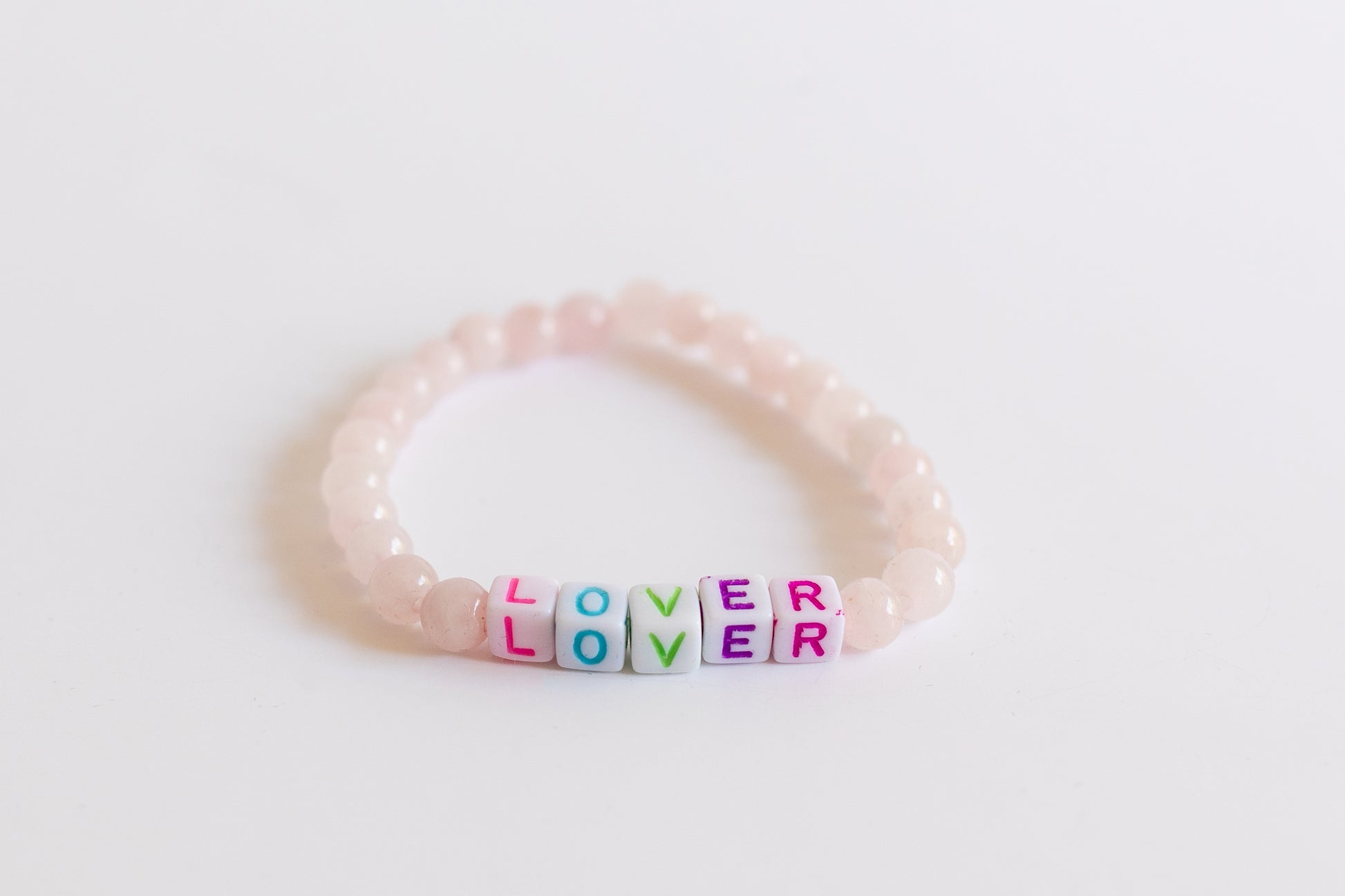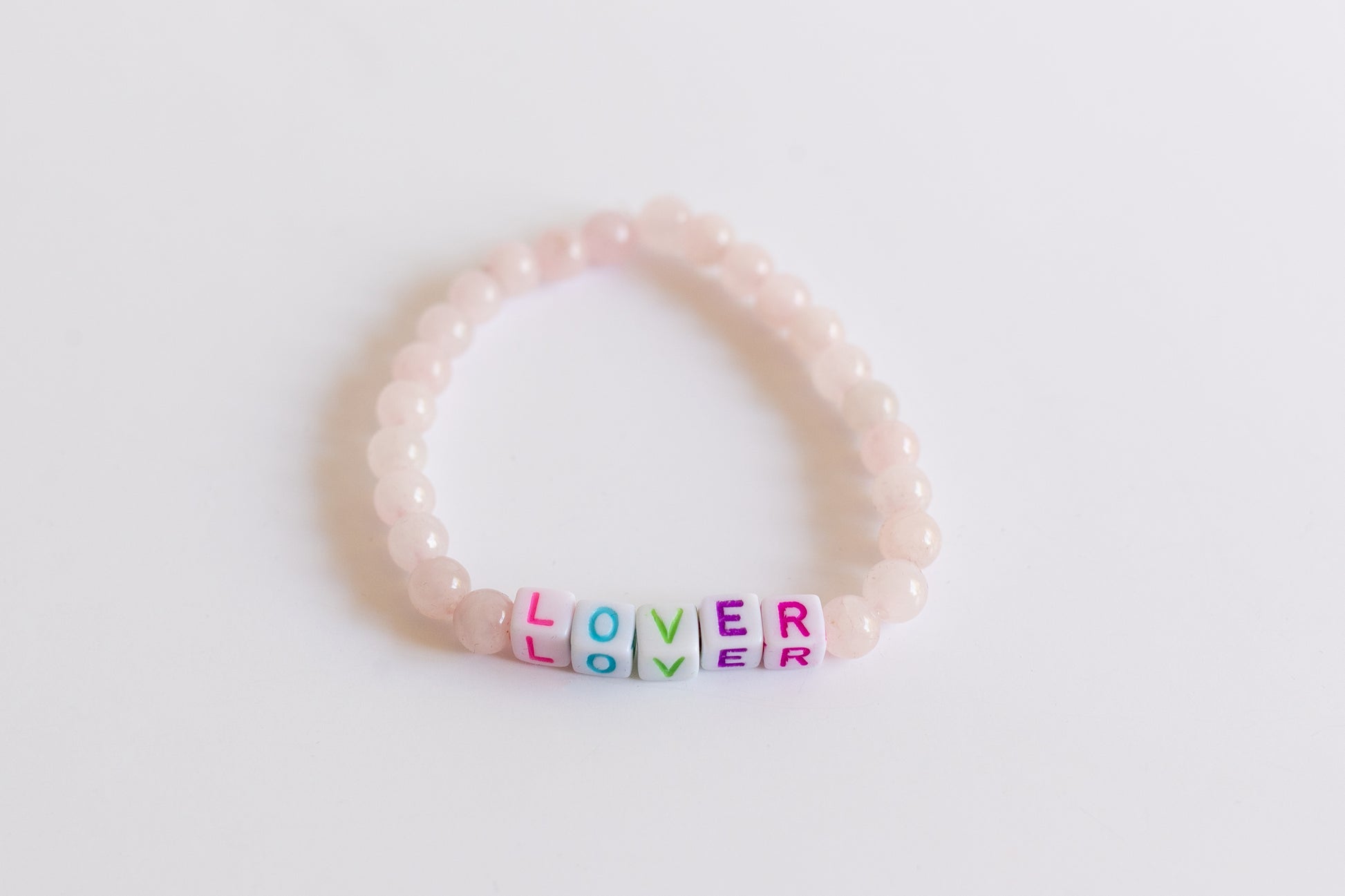 A delicate bracelet featuring calming Rose Quartz crystals and rainbow coloured wording.